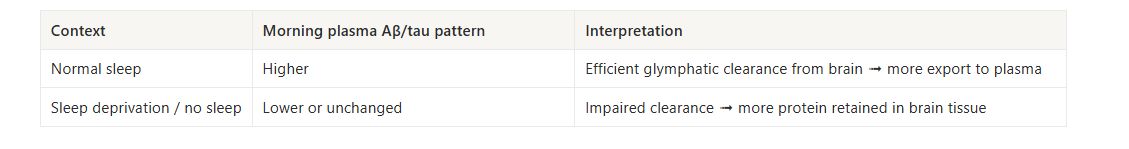 This is why a lower or unchanged morning blood level after poor sleep likely means more amyloid-β and tau stayed in brain tissue, not that less was produced.