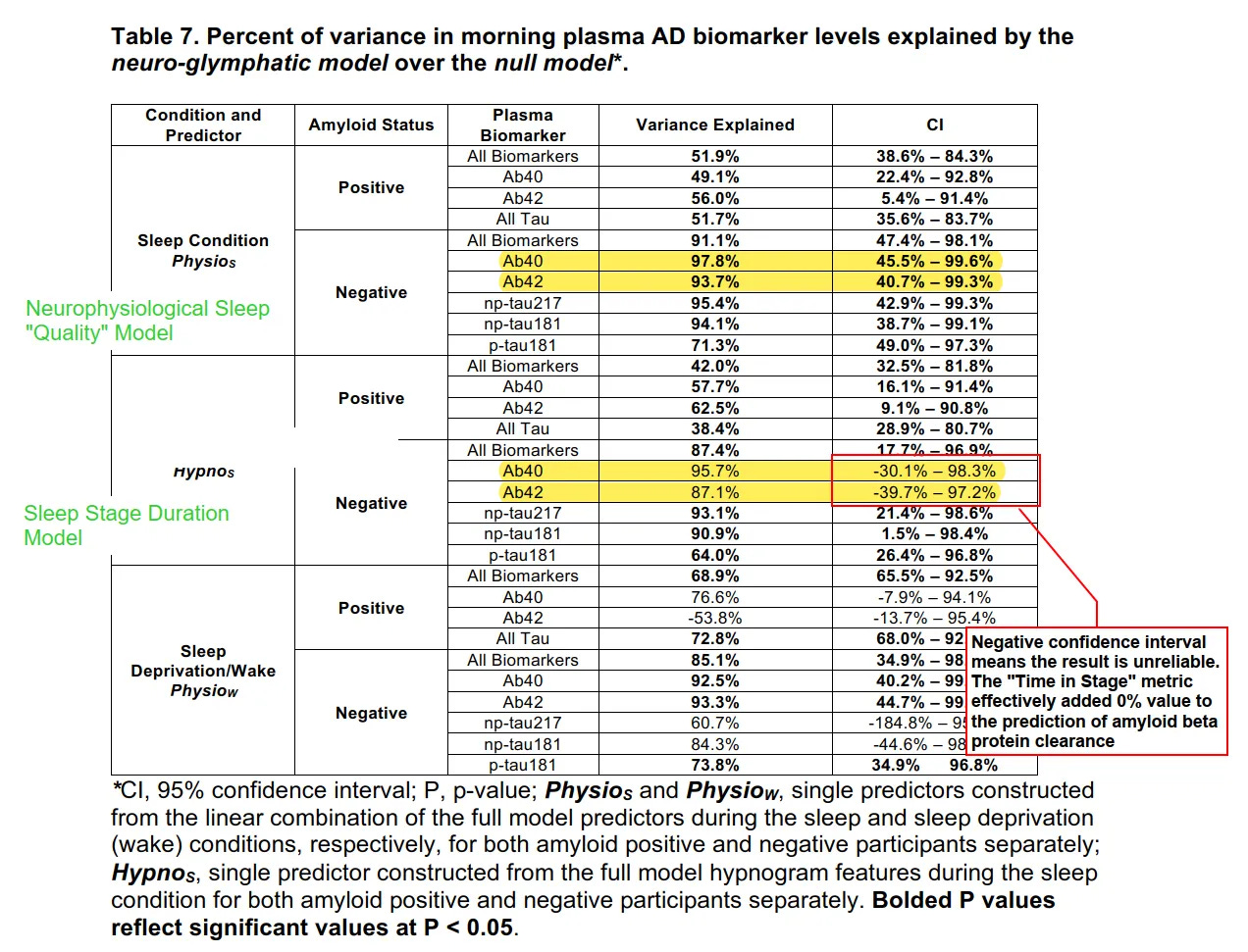 Sleep Stage Duration: The time spent in Deep Sleep (N3) did not perform better than the statistical baseline (a prediction based on the participant’s evening levels). In the data, this metric had a confidence interval of -30.1% to 98.3%. Because this range includes negative numbers, the result is indistinguishable from 0; this is interpreted to mean that sleep stage duration effectively accounted for 0% of the change in amyloid removal.