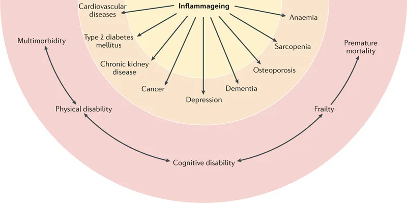 Chronic low-grade inflammation is linked to accelerated aging across multiple systems.