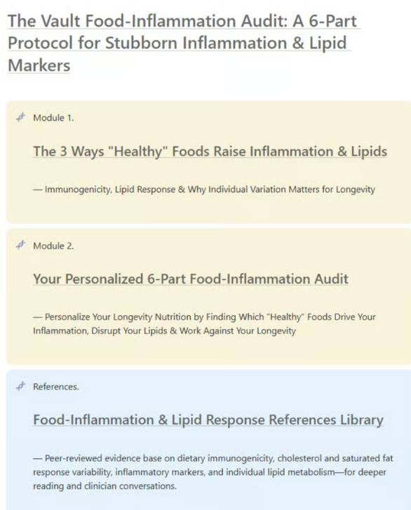 If you would like to Access the The Vault Food-Inflammation Audit: A 6-Part Protocol for Stubborn Inflammation & Lipid Markers as a one-time option (without an ongoing subscription), you can access that here: