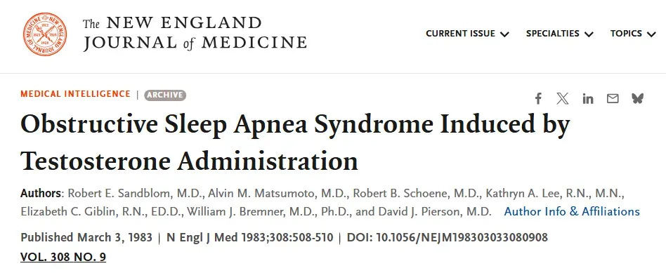 Sandblom RE, Matsumoto AM, Schoene RB, Lee KA, Giblin EC, Bremner WJ, Pierson DJ. Obstructive sleep apnea syndrome induced by testosterone administration. N Engl J Med. 1983 Mar 3;308(9):508-10.