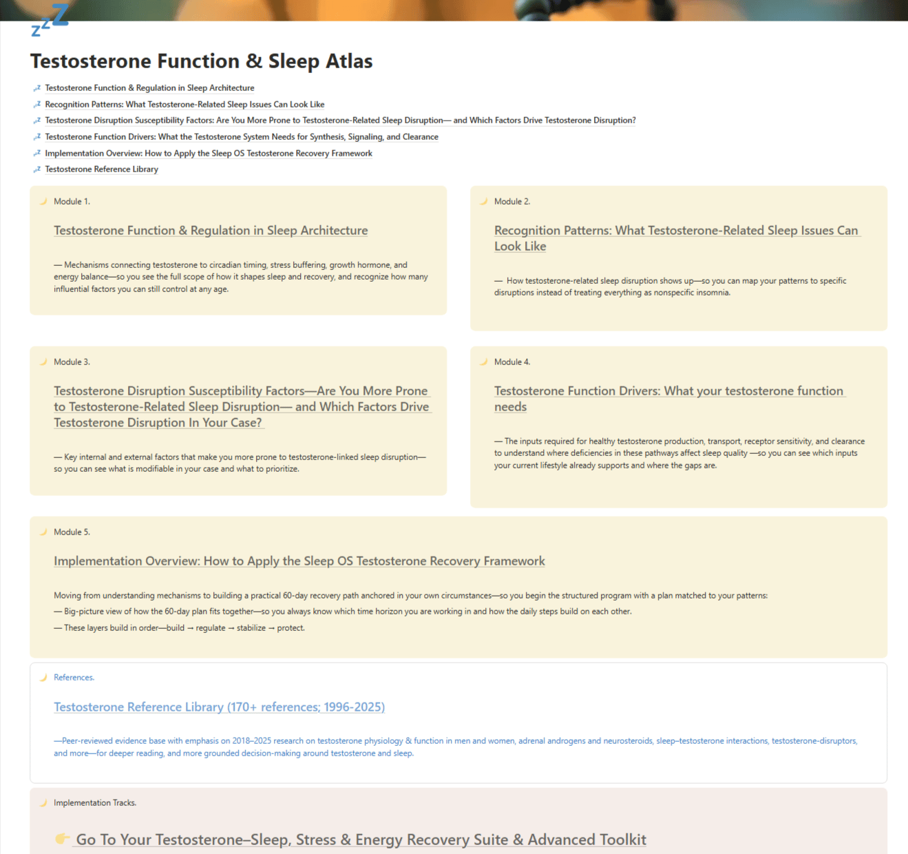 It builds disruption profiles for testosterone, estrogen, and progesterone in midlife and beyond, then walks you through resolving the modifiable disruptors so your hormones can support sleep.