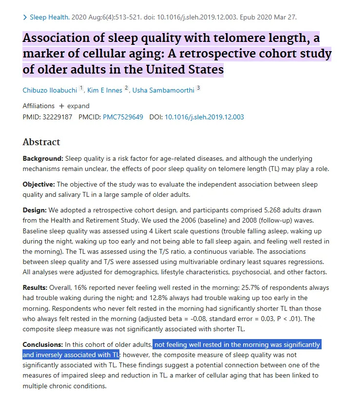 Iloabuchi C, Innes KE, Sambamoorthi U. Association of sleep quality with telomere length, a marker of cellular aging: A retrospective cohort study of older adults in the United States. Sleep Health. 2020 Aug;6(4):513-521. doi: 10.1016/j.sleh.2019.12.003. Epub 2020 Mar 27. PMID: 32229187; PMCID: PMC7529649.